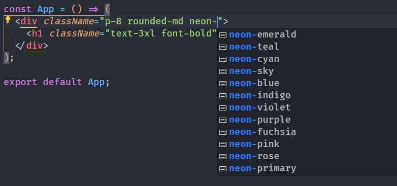 Now, if you are using the Tailwind CSS IntelliSense extension in your VSCode, you will see our neon-* classnames appearing in the auto-complete suggestions.